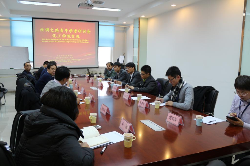 下午学院安排了领导与青年学者的座谈讨论,化机系主任张早校教授,化工系主任伊春海副教授,催化研究所所长杨伯伦教授分别向青年学者们介绍我院的“两系一所”概况。青年学者分别就我校的设备配置及使用情况、学校的青拔配套待遇、人才扶植计划、研究方向的契合性等方面和在座各位领导教师进行深入交流,学院最后还安排青年学者参观了陕西省能源化工过程强化重点实验室和学院教学实验中心等实验室,此次学院交流取得了圆满成功。