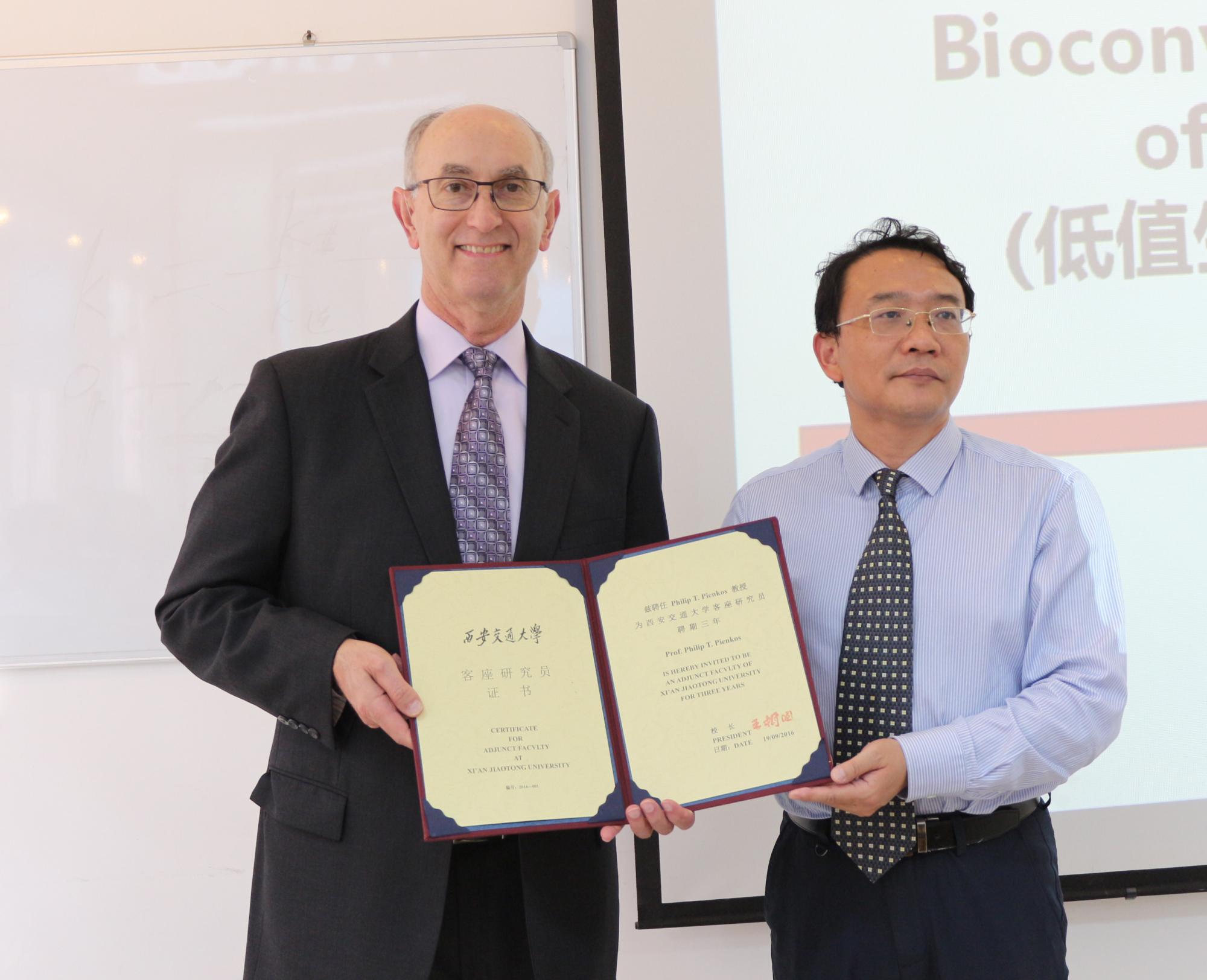 院长魏进家、化工系主任伊春海、学院的教师及研究生参加了此次受聘仪式和本次研讨会,仪式由魏进家院长主持。魏进家院长首先介绍了Philip Pienkos学者的基本情况,他是生物能源领域的国际知名专家,长期从事第三代生物能源的研究工作,主持和参与了多项由美国能源部资助的数十项重大研发项目并连续五年被BiofuelsDigest网站评选为世界生物能研究百名杰出人物(TOP100 People in Bioenergy)。