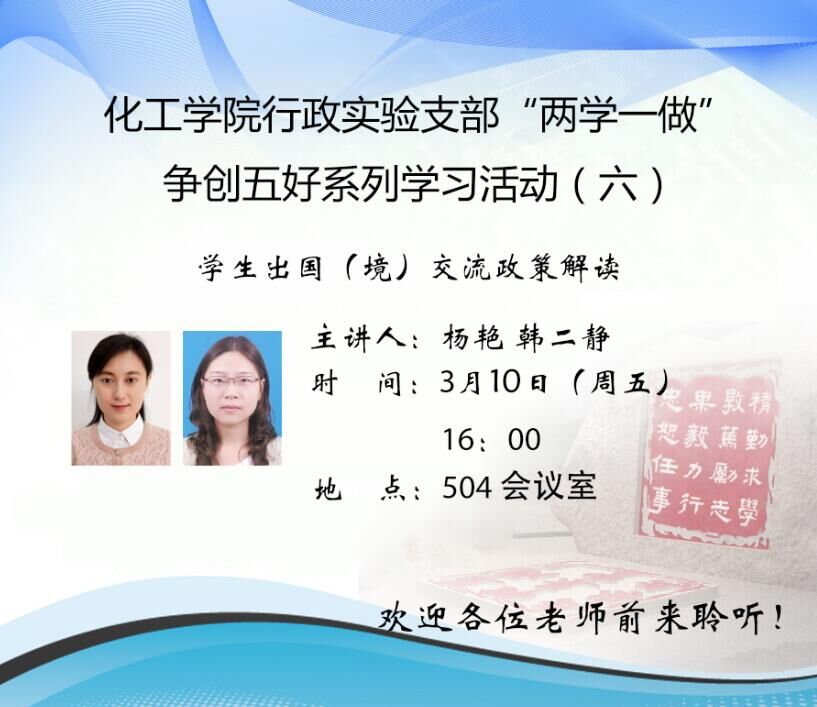 行政与实验党支部举办了“学生出国(境)交流政策解读”宣讲会。本次宣讲会由支部书记张敏老师主持,由杨艳、韩二静两位老师联合主讲,支部全体同志以及学院有志出国留学的本科生、硕士生和博士生参会。