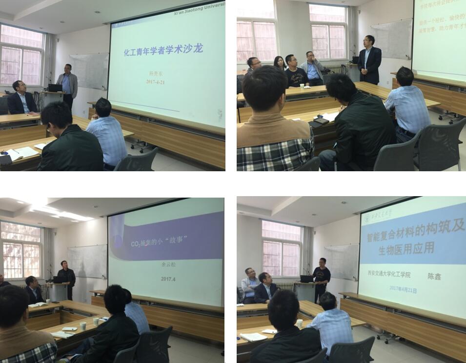 4月21日下午,我院在106会议室举办了2017年第一期学术沙龙活动,陈鑫研究员、余云松副教授分别作了题为《智能复合材料的构筑及生物医用应用》和《CO2捕集的小“故事”》 的报告。全院青年教师参加了学术沙龙,院长魏进家作为特邀嘉宾出席了活动,并做了讲话。会议由院长助理杨贵东副教授主持。