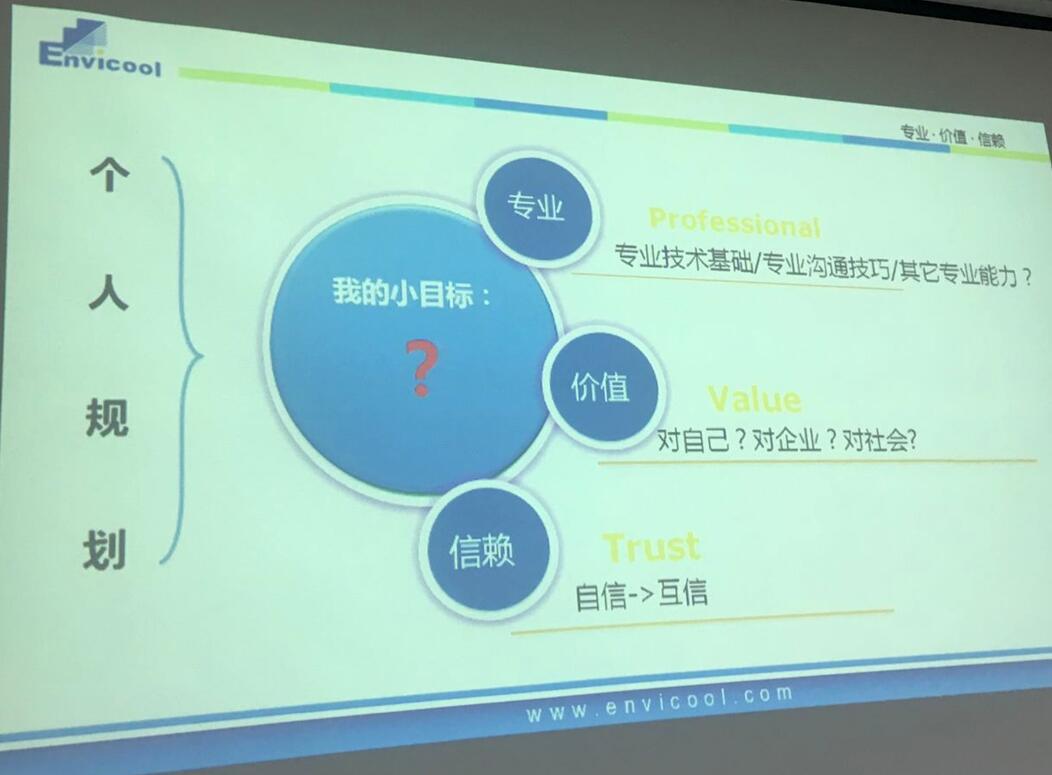 韦立川校友首先分享了英维克公司的成长经历,并用“专业”、“价值”和“信赖”三个关键词解读了公司的发展历程和自己对这几个词语的理解,提出专业必须要与社会需求契合、价值要遵循双向的原则、而信赖则是基于价值的基础才会产生。