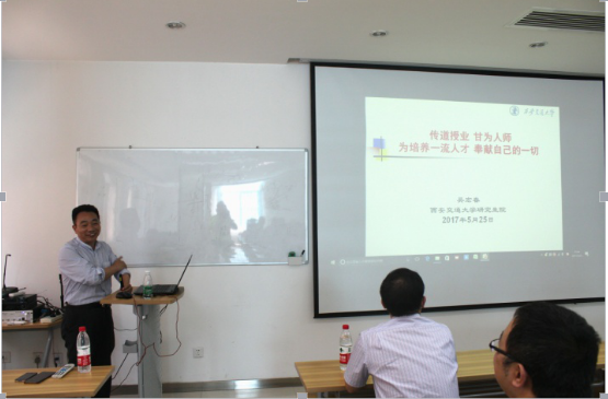 邀请研究生院常务副院长吴宏春教授在化工办公楼106会议室举办了“传道授业,甘为人师”主题讲座。讲座由学院党总支书记张早校主持,学院院长魏进家、副院长李云、方涛及全体教职工参加了本次讲座。