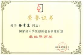 唯一一位连续两次指导本科生获得该奖项的老师)。指导研究生/本科生于2016年获得首届“丝绸之路”国际大学生创新创业大赛国际赛一等奖(由科学技术部、教育部、甘肃省人民政府、外事局等6家单位共同主办)。指导本科生获首届苏州独墅湖大学生创业夏令营“项目路演优秀奖”。指导研究生/本科生获得2016年金张掖创新创业大赛三等奖。杨贵东副教授在创新创业教育指导方面大胆创新,将基础研究与工业实践相结合,取得了可喜的成果。