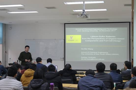 继李峰研究员报告会后,来自新南威尔士大学的王大伟博士又做了一场题为“Lithium-Sulfur Batteries from the Perspectives of Organic-based Materials and Full Cell Design”的精彩报告。王大伟博士主要从事先进能源材料的设计、制备及理论、锂离子电池、锂硫电池以及功能材料的电化学研究,是一位儒雅的青年才俊,报告中他详细阐述了如何利用有机框架材料限制多硫化物的溶解,以及如何设计主-客体材料助力储能器件整体性能的提升等问题。王大伟博士语言流畅舒缓,思路清晰明朗,让在场师生不仅收获了知识,也对其科研工作产生了启发。