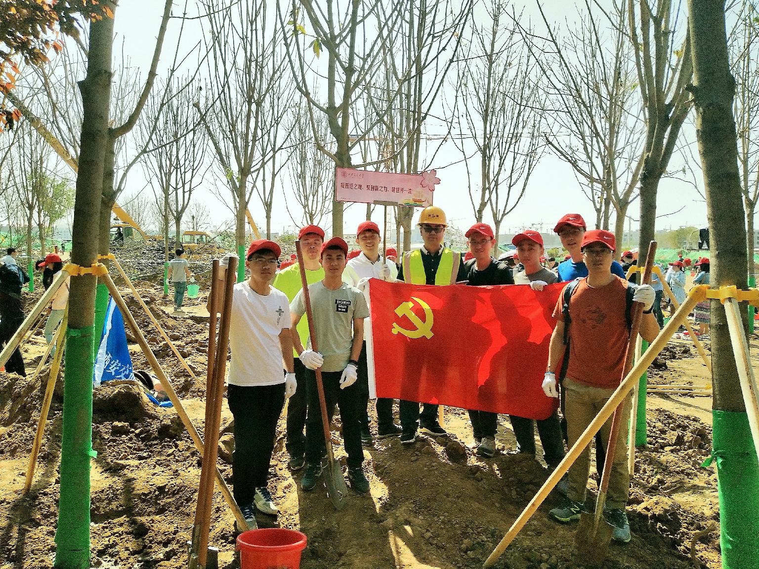 植树活动过程中同学们满怀热情,或者执铁锹做水槽,或者排队提水浇树,大家分工明确配合默契,亲自种下了一棵棵娑罗树。来自化机博士党支部的柴孟瑜表示,六十多年前交大老一辈们胸怀大局无私奉献从黄浦江畔来到西安带来了梧桐树,希望这些树木向兴庆校区的梧桐树那样茁壮成长绿树成荫,大树西迁扎根西部,博士毕业后他将留校,彼时可以和这些树木一同成长。化工16党支部的朱佛代谈道,希望多年以后再回母校还可以看到今天载种下的这些树,树在长大自己也在成长,母校所在的方向始终是自己最牵挂的方向。化机博士党支部的张洋说,今日一棵树,他日必成林,科研之路如同西行取经,应当始终心无旁骛矢志笃定,西部的富强、中国梦的实现必然要在一代代西迁传入的接力奋进中实现的。