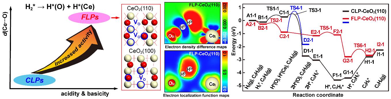 近日,我院常春然课题组在前期研究(Nature Commun. 2017, 8, 15266)基础上,对二氧化铈基表面FLP的物化性质及催化性能又开展了深入的理论研究。他们利用第一性原理计算方法,通过计算探针分子在酸碱位点的吸附能,发现通过氧空穴调控在二氧化铈表面构筑的FLP,其酸碱性与经典路易斯酸碱对(CLP)相比都有明显的增强。通过分析H2在表面FLP上的分解过程,发现表面FLP增强的酸碱性与合适的酸碱位点空间距离,共同起到了高效催化氢气异裂的作用;而且,异裂产生的负氢离子可以在FLPs的酸性位点上稳定,明显区别于CLP上的负氢很容易转移到氧原子上。在后续的加氢反应中,表面FLP一方面提供了具有更高活性的负氢,另一方面碳氢物种可以避免与表面氧形成强结合的C–O键,因此导致表面FLP具有高的加氢反应性能。该项工作从原子水平上揭示了二氧化铈基表面FLP的高催化活性本质,同时为后续固体 FLP催化剂的设计开发提供了重要理论依据。