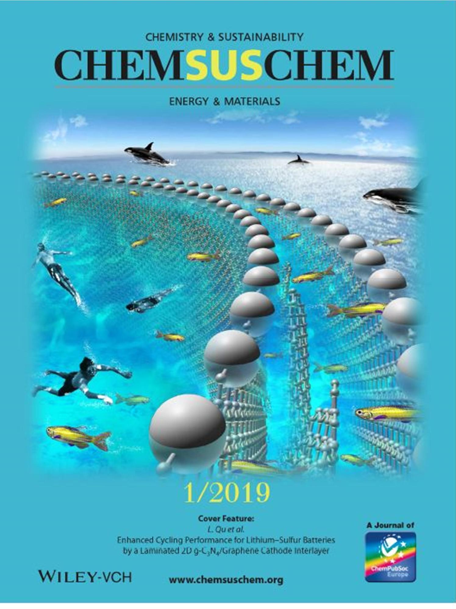 李明涛课题组设计开发了一种具有二维结构g-C3N4/石墨烯保护层的正极材料,获得了长循环寿命的锂硫电池。相关论文发表在国际著名期刊ChemSusChem并入选为封面文章(Enhanced Cycling Performance for Lithium–Sulfur Batteries by a Laminated 2Dg-C3N4/Graphene Cathode Interlayer, DOI: 10.1002/cssc.201802449)。我校讲师屈龙为第一作者,李明涛副教授为第一通讯作者,美国橡树岭国家实验室戴胜教授为共同通讯作者。