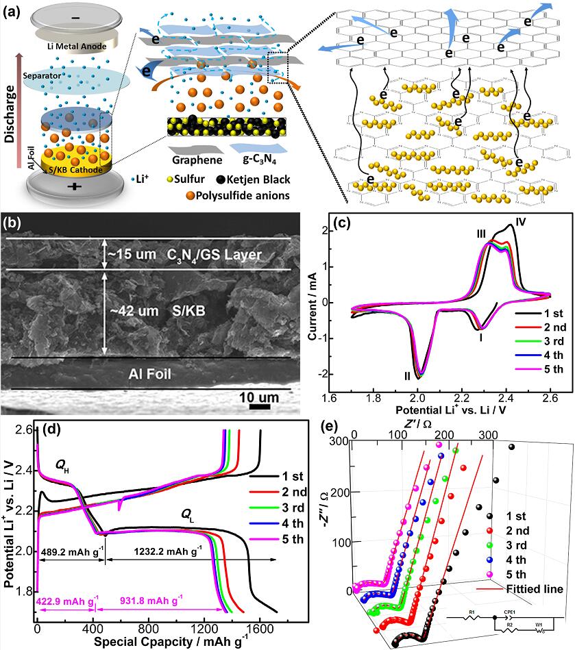 该工作创造性地设计了一种二维插层结构的g-C3N4/石墨烯夹层,如同在电池正负极之间构建了多层“防鲨网”,不仅能通过物理和化学双重作用阻挡多硫化物(Li2Sx, 2<x<8, 鲨鱼)在正负极之间穿梭,还能加快Li+(鱼)的扩散,从而大大提升电池的循环寿命。该论文对提升锂硫电池电化学性能及进一步实现产业化具有理论指导意义。