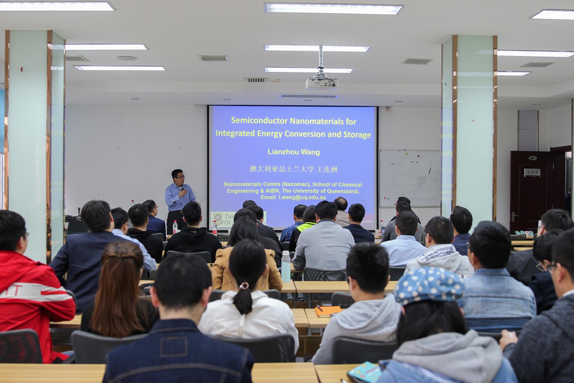 客座教授,也非常愿意为交大化工学科的发展贡献自己的绵薄之力。受聘仪式后,王连洲教授做了题为“Semiconductor Nanomaterials forIntegratedPhoto-electrochemical EnergyConversionand Storage”(半导体纳米材料用于整合光-电化学能量转化和存储)的精彩报告。他介绍了其课题组近年来在光催化产氢产氧以及储能方面的最新研究进展。一,通过梯度掺杂、晶面调控、引入缺陷位等方法实现了层状半导体材料具有很强的光电流特性;二,通过反应器的设计实现PEC反应中氢气和氧气的自动分离;三,通过构建新型二维纳米片光电极,得到高性能的太阳能电池。最后,在场的师生们积极提问,纷纷表示受益匪浅,现场气氛活跃,使得本次报告达到了很好的深入交流效果。