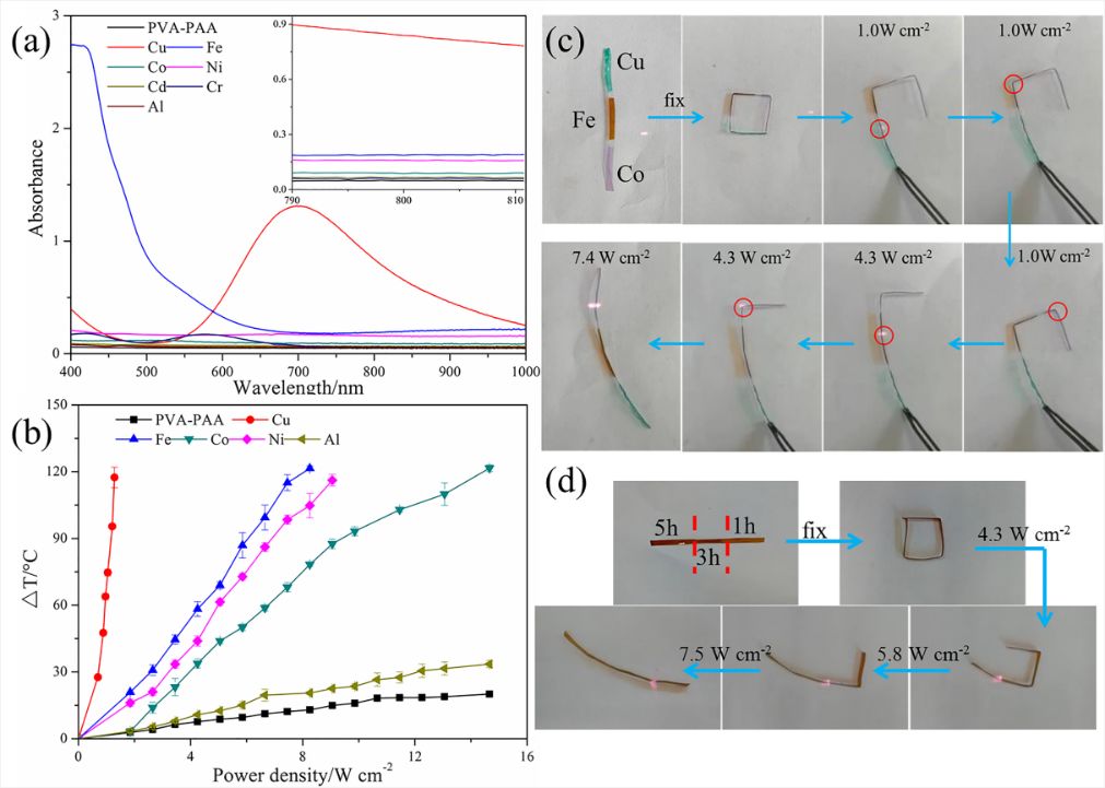 图2 (a)不同离聚物的的UV-vis-NIR光谱;(b) PVA-PAA和不同离聚物的光热转换效率;(c)由PVA-PAA-Cu、-Fe和-Co构建的离聚物的光致多段形状记忆行为;(d)梯度Fe3+离子在光诱导下的多段形状记忆行为。