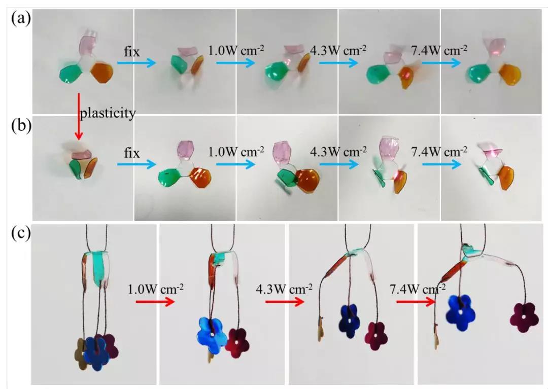 而将材料的光致形状记忆性能与光致塑性向结合,则可以实现聚合物材料更复杂的形状变化。通过逐步交联方法制备三瓣花形样品并通过折叠变形以及光致塑化,利用不同功率密度NIR光就能控制花瓣的开合。课题组还进一步设计了光致驱动器的重力提升试验以及光控开关试验,结果表明通过调控近红外光功率密度可以实现对光致驱动行为的选择性控制。