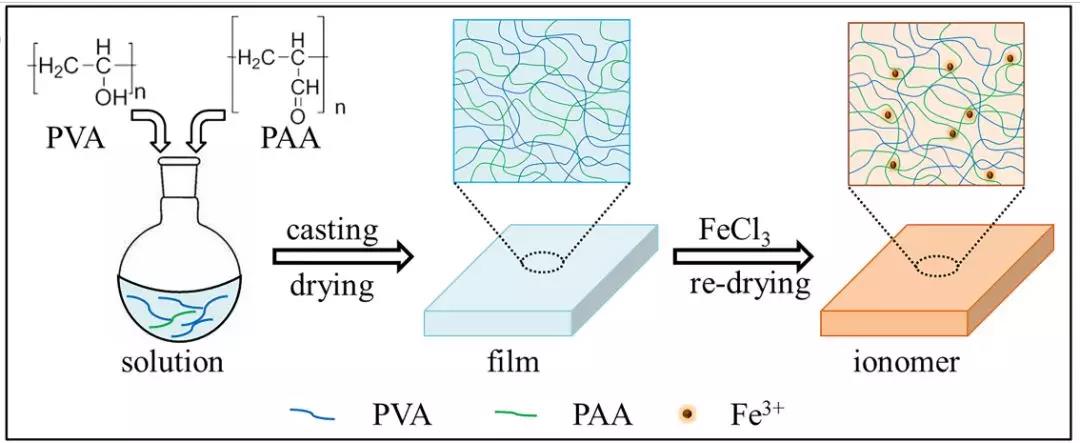 陈鑫研究员课题组设法将NIR吸收单元直接引入SMP的聚合物网络结构中而不改变聚合物网络的结构和性质。在此,他们使用商业化聚合物聚乙烯醇(PVA)和聚丙烯酸(PAA)作为骨架和各种金属离子通过离子交联作用制备了一系列具有多段响应性的新型NIR光致形状记忆离聚物。