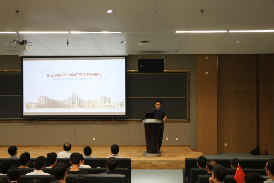在创新港5号楼辅楼东侧会议室,隆重举行学院2019级研究生新生开学典礼。分党委书记张早校、副院长方涛、副书记沈人杰,学科主任杨伯伦教授及学院全体研究生新生导师,2019级全体研究生新生及新生班主任、辅导员参加,会议由院办主任蔡元汉主持。