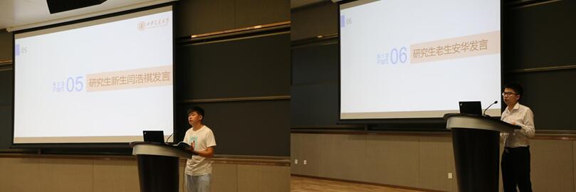 17级老生代表安华分享了个人在学院学习和科研的经历,希望学弟学妹们尽快调整状态,合理安排时间,牢记使命和担当,不负韶华!19级新生代表闫浩祺提出要调整好心态,迎接新的生活,认真学习,潜心钻研,努力发扬西迁精神。