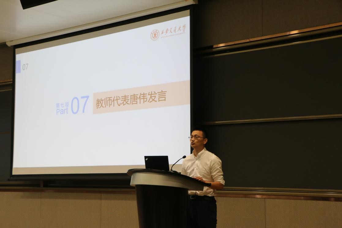 教师代表,学校青年拔尖人才唐伟教授以“兔子”为例,生动有趣地比喻了本科生、研究生和博士生学习的区别。唐老师在发言中强调了大量阅读文献资料和提升创新思维和想象力的重要性,希望同学们要有专注和坚持的精神,不断攻坚克难,不断攀登,实现自己的学术和人生价值。