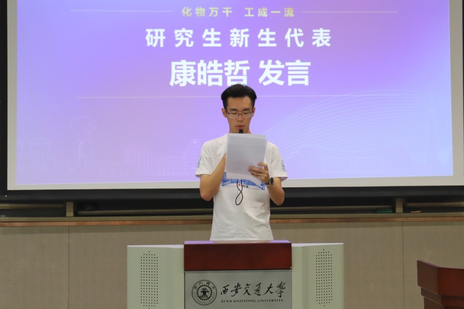 新生代表康皓哲发言,他分享了自己作为三新班一名成员的学习和工作经历,在祝贺各位同学开启新的求学之路的同时,也号召全体新生潜心科研,传承好西迁精神,助力创新港建设。