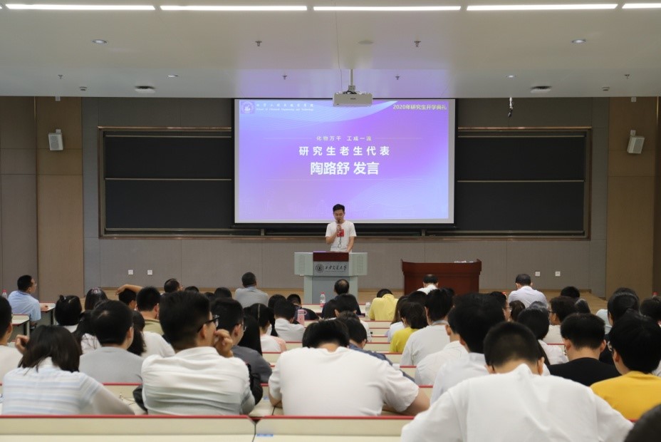 老生代表陶路舒发言,他首先代表全体老生对新同学的加入表示欢迎。作为第一批入驻创新港的学生,他分享了学校建设创新港的历程和这片神奇的土地所蕴涵的希望,他鼓励新生要打开格局,以科研之美的心态去努力科研。最后他祝愿所有的化工人都能心里有火,眼里有光,以必成之心,创未有之业。