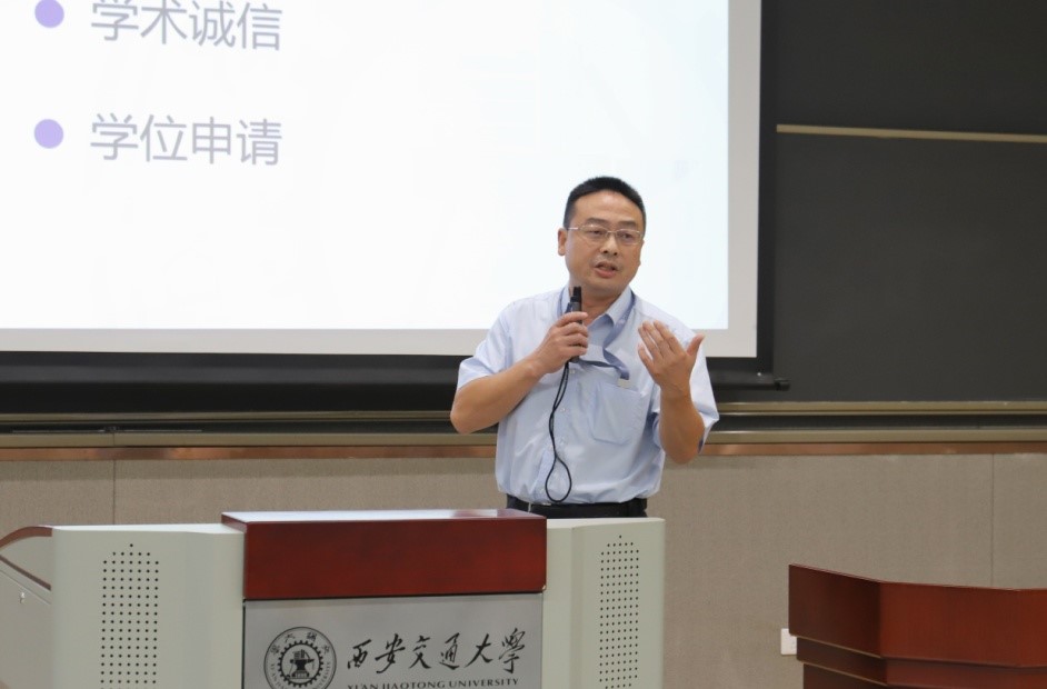 副院长方涛教授介绍了学院研究生管理制度。他主要从录取简况,用人单位满意度、个性化培养体系、学术诚信、学位申请、双一流建设中期目标完成情况等几个方面进行了说明,并对《关于几点高校学位论文作假行为查处情况的通报》文件进行了解读。