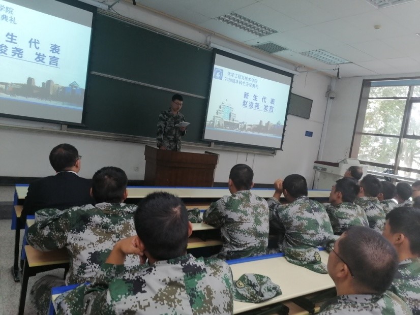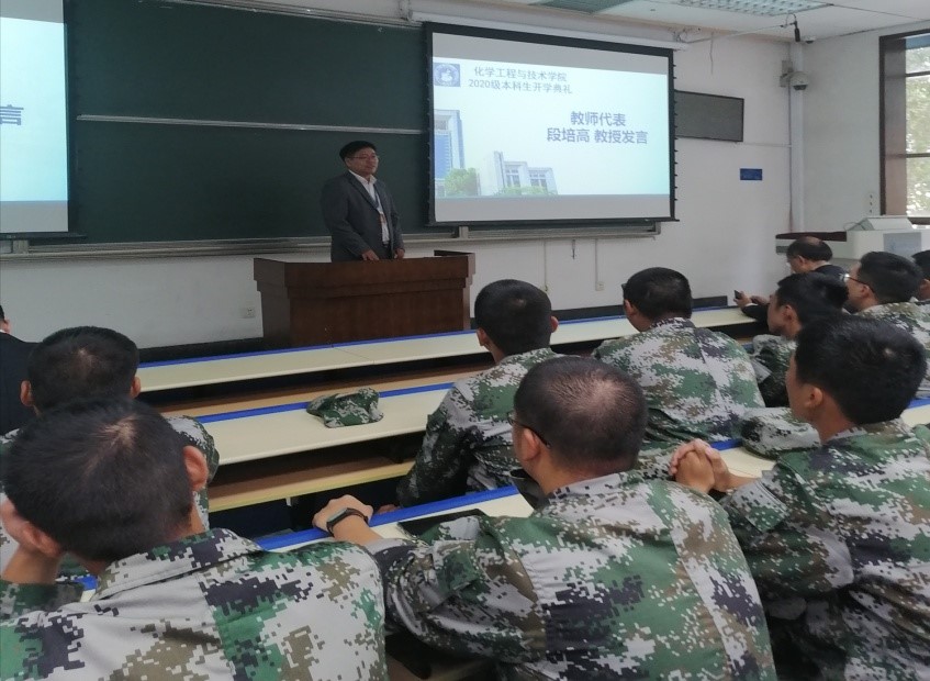 教师代表段培高教授发言,他首先代表全体教师对全体新生选择学校和学院表示感谢和欢迎,并以中国在抗击肺炎疫情中取得的胜利为引子,勉励全体新生要志存高远,践行西迁精神,拼搏现在,成就未来!
