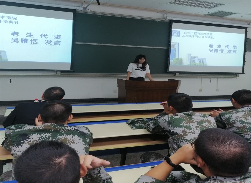 老生代表吴雅恬发言,她简单回顾了自己度过的大学生活,鼓励新生要保持好奇心,多一些努力,敢于直面挫折和困难,不断丰富自己的知识和阅历,成为有担当的西迁精神新传人。