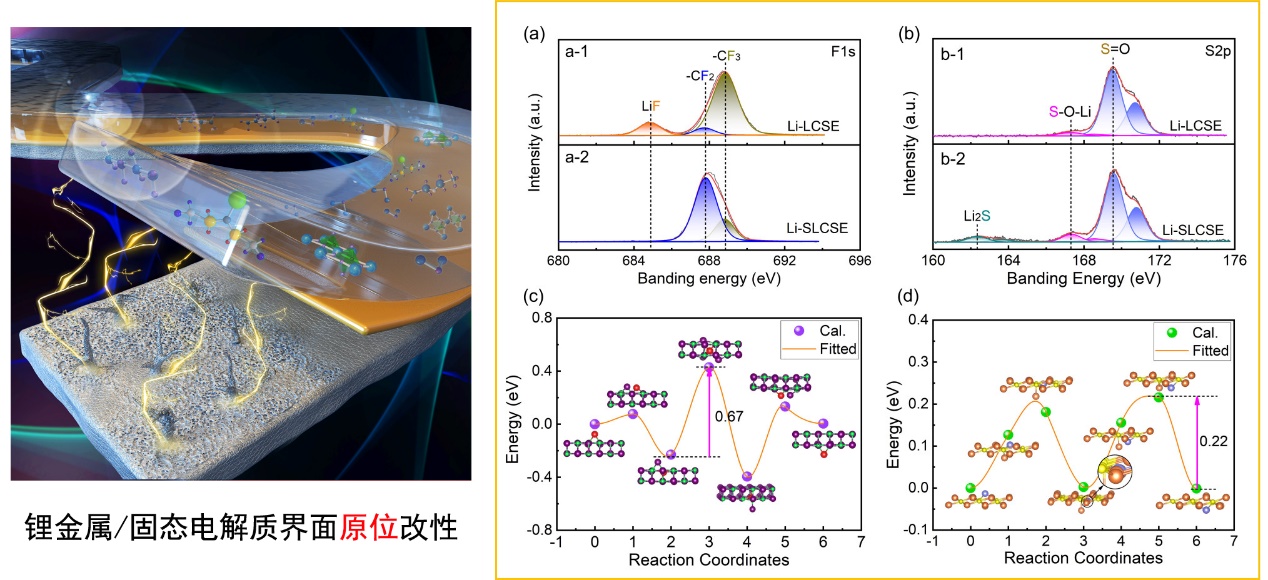 唐伟教授团队与新加坡国立大学化学与生物工程系郑光远助理教授、北京航空航天大学缪奶华副教授合作,联合报道了一种3Li2P⸱2P2S5-LiTFSI-PVDF复合固态电解质(SLCSE)。该复合固态电解质在电池充放电过程中,能够在锂金属负极表面原位生成一种含Li2S修饰的界面层。实验结果显示该界面层能够减缓复合固态电解质中PVDF的分解。结合理论计算发现该界面层还可以同时提升复合固态电解质与电极之间的界面接触性能,并降低锂离子通过界面层的势垒,有效改善了锂在负极的沉积均匀性,从而抑制锂枝晶的生长。