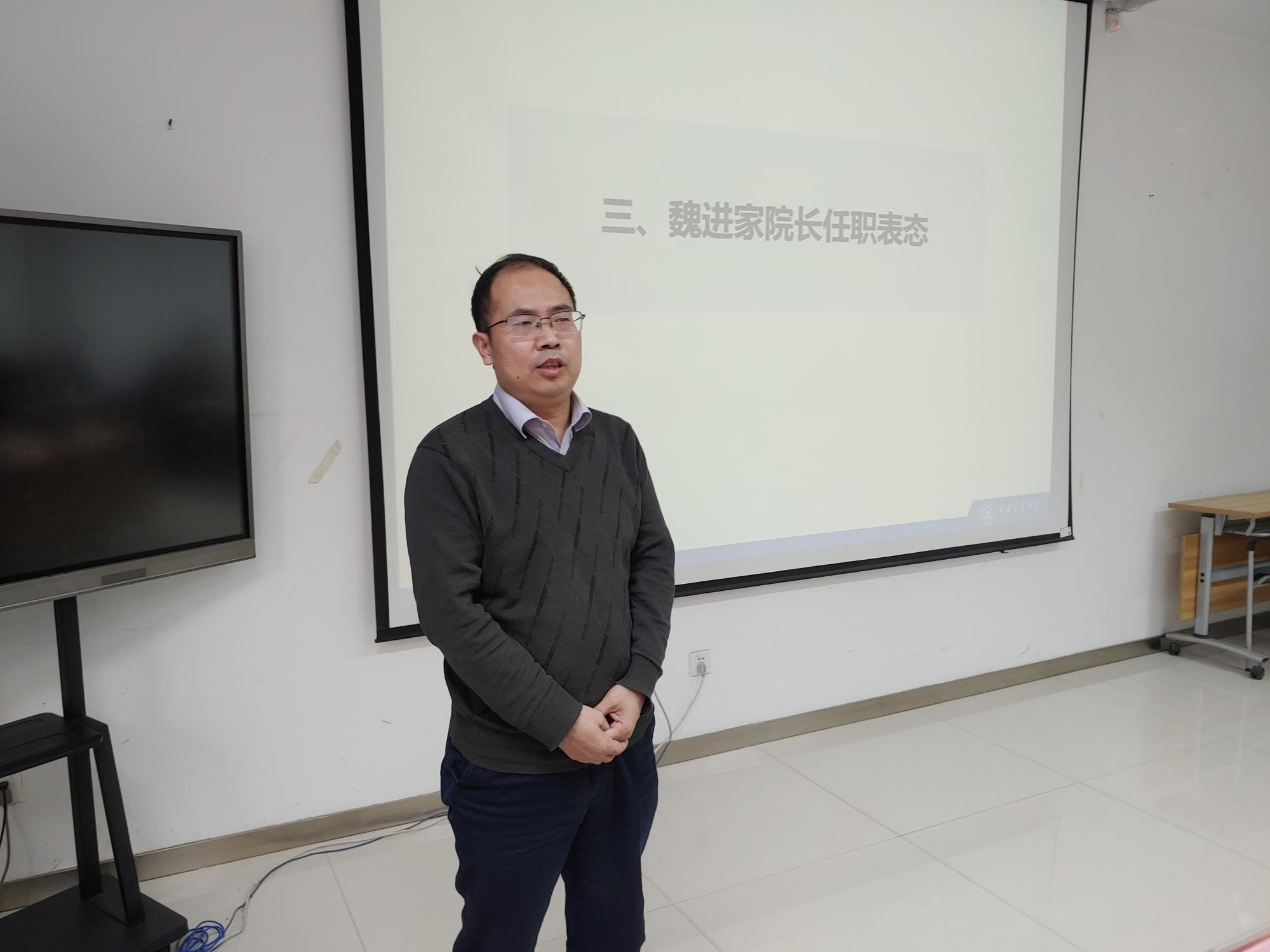 院长魏进家代表学院新一届行政班子作表态发言。他感谢学校党委对新一届行政班子的信任,感谢上届班子对学院发展作出的贡献,同时感谢全院教职工的支持。作为院长,一是全身心投入学院管理。在理论能力、学院治理、战略性思维、顶层规划方面深入学习;二是做好班子建设。新班子相互信任,党政团结,以上率下,继续营造学院和谐氛围;三是通过深入交流了解教师心声,凝聚集体智慧,做实基层组织治理体系现代化建设。