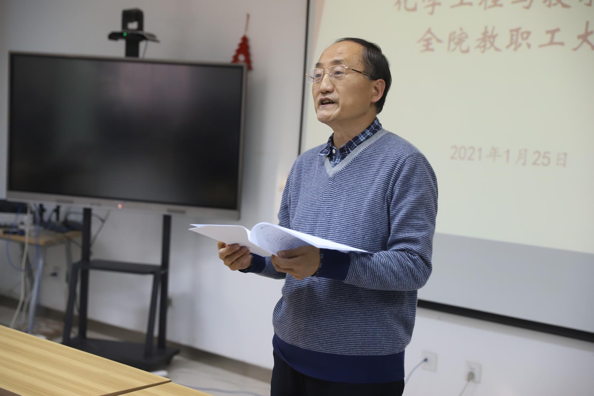 2020年度工作总结及2021年工作计划》报告,全面总结了学院2020年及“十三五”期间在学科与队伍建设、人才培养、科研、国际化、创新港建设等十一方面的成绩,梳理了学院发展过程中存在的问题,并围绕化工学科建设、学院治理体系建设、研究所体制机制建设等重点工作对学院2021年工作作出部署。“缓进则退,不进则亡。希望全院教职工凝心聚气,乘势而上,共同参与到学院治理中来,落实各项任务,实现追赶超越。”