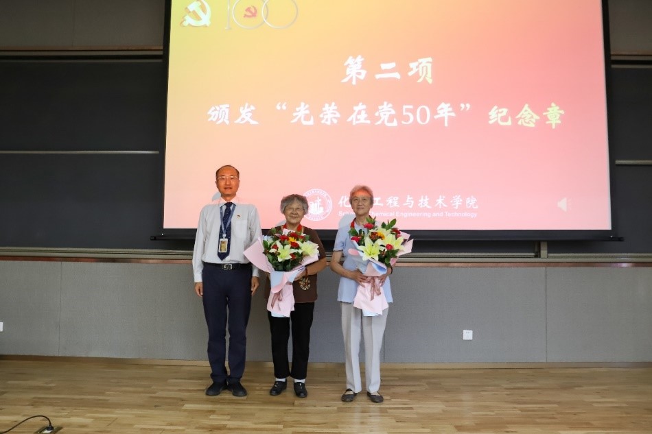 表彰大会在师生共唱国歌中拉开帷幕。本次大会,学院专门邀请了“光荣在党50年”纪念章获得者代表刘芙蓉教授、茅素芬教授参会,分党委书记张早校为两位教授颁发“光荣在党50年”纪念章。两位老教授分别进行了发言,在诚挚表达个人对党的感恩之情的同时,也勉励全体师生继续发扬西迁精神,心怀国家和人民、为实现中华民族伟大复兴而努力奋斗!