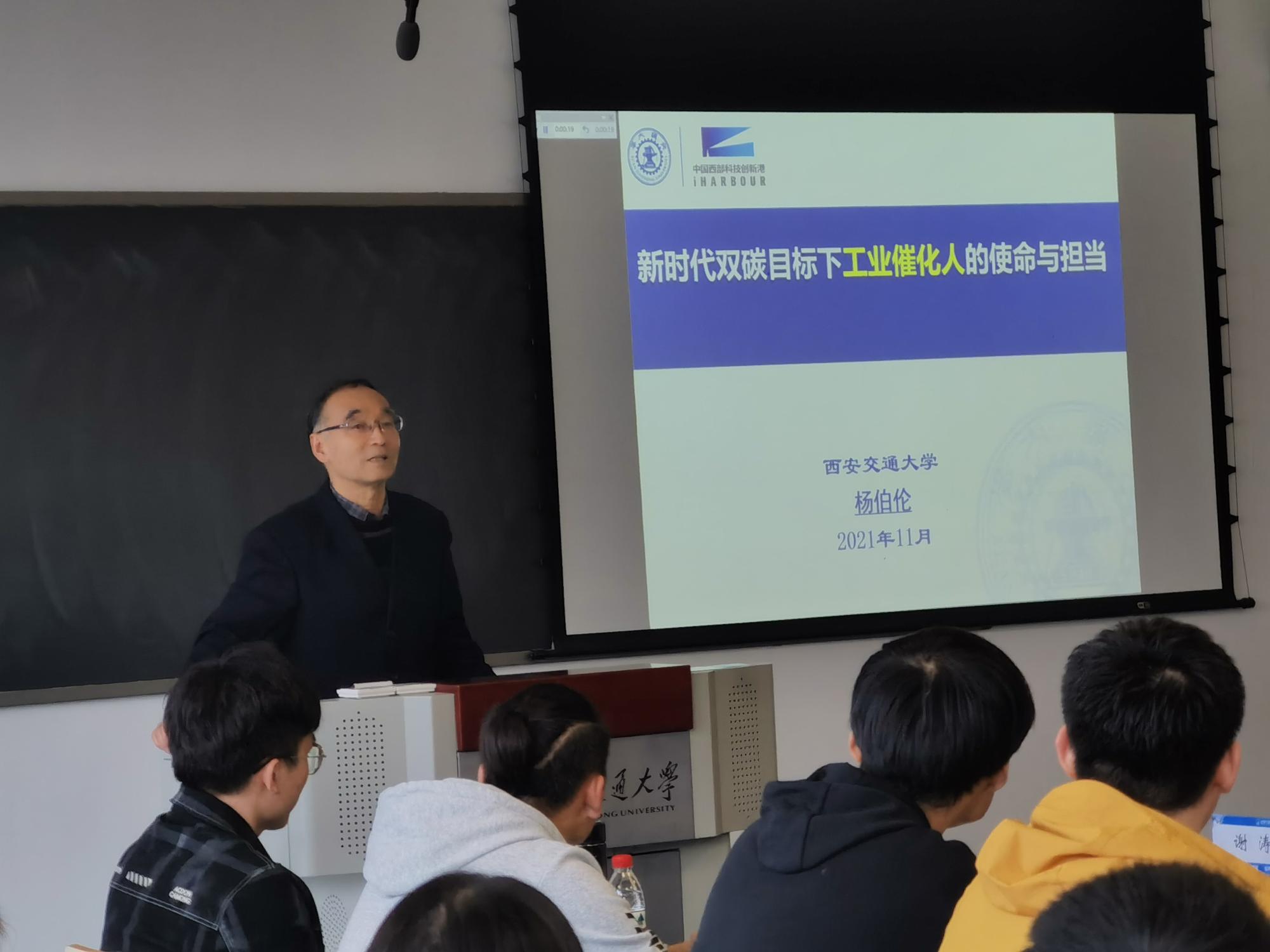 随后,杨伯伦教授讲授了题为“新时代双碳目标下工业催化人的使命与担当”的新生第一课。杨伯伦教授从认识工业催化学科、工业催化的发展历史和工业催化人的使命三个方面展开,让大家领略到了工业催化学科的魅力,认识到双碳目标下的工业催化将具有更加重要的地位,同时勉励大家作为工业催化人,需要努力学习,积极探索,主动承担起时代赋予的使命。