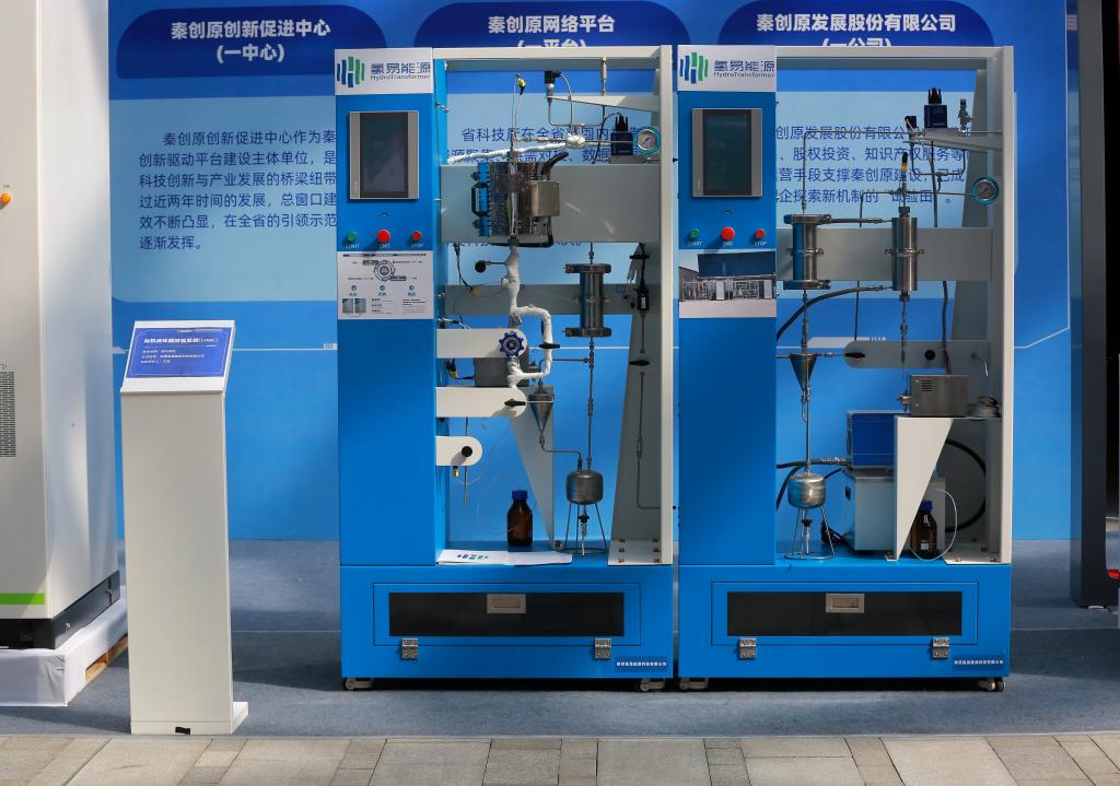 方涛教授团队落地秦创原成立的陕西氢易能源科技有限公司参展。公司展品“有机液体储放氢原理验证装置”、“新型有机液体储氢材料及配套催化剂”置于展厅中心位置。