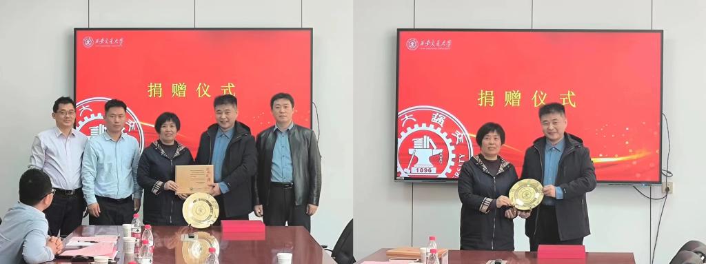 党委书记苗晋英向豪迈集团颁发捐赠铭牌并回赠交大纪念品。