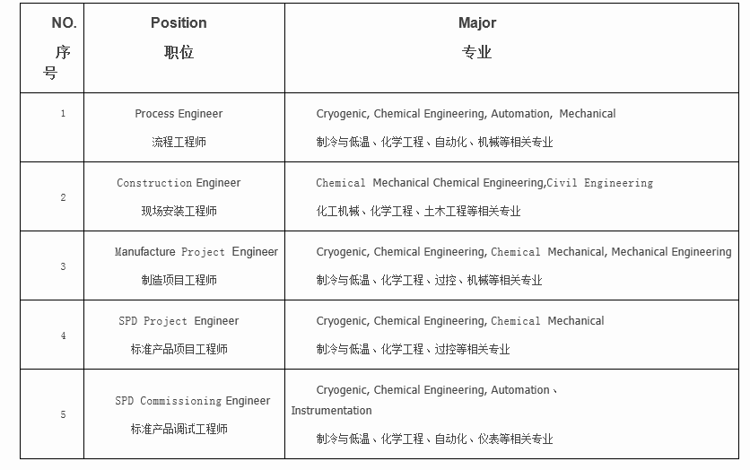 Master degree, majored in Cryogenic Engineering, Chemical Engineering, Automation, Chemical Machinery Engineering and so on;