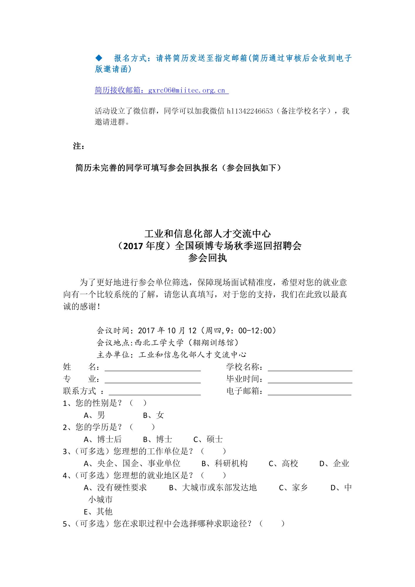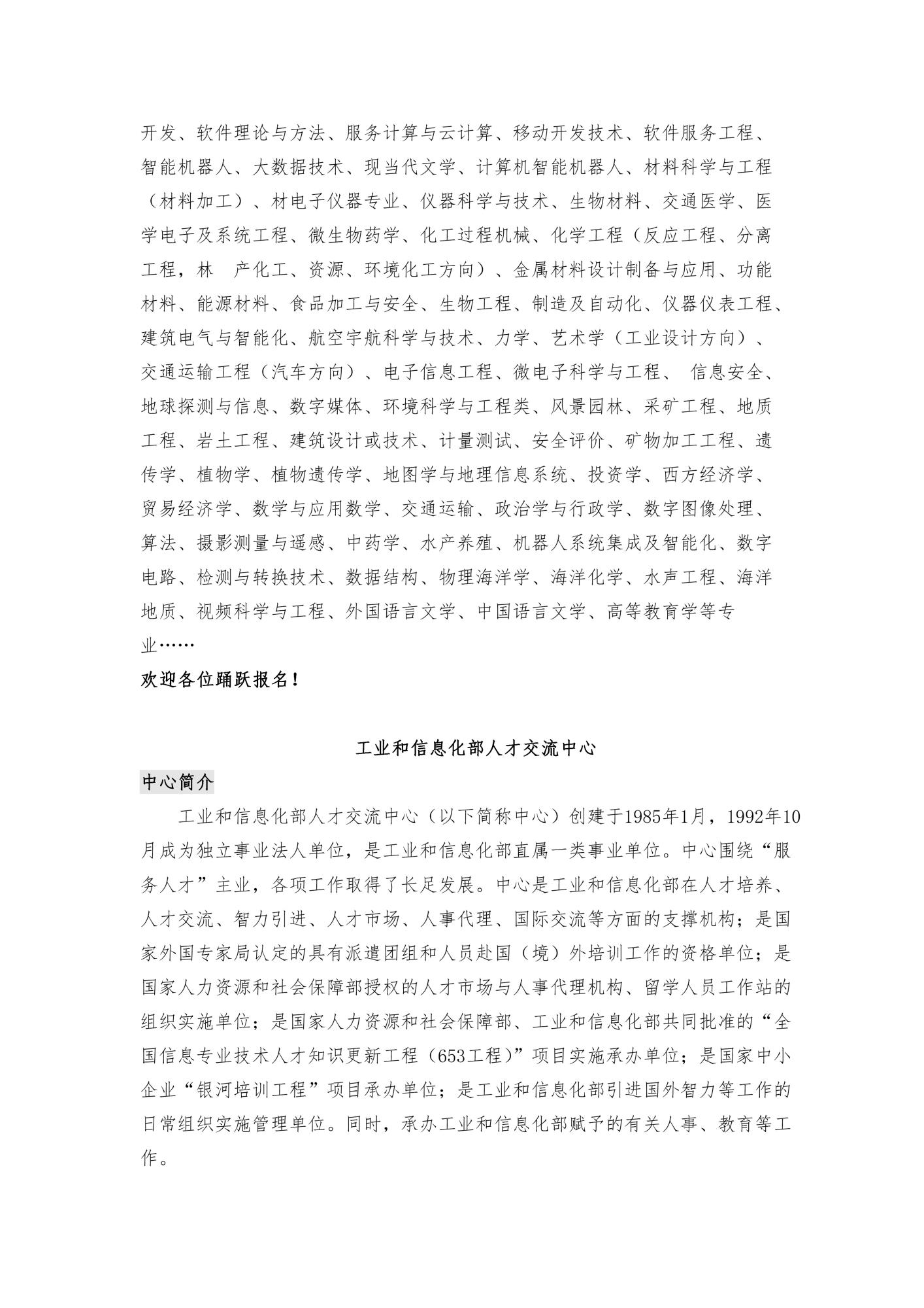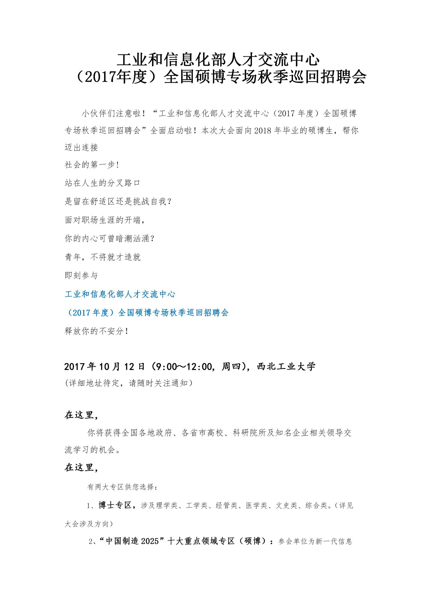 工业和信息化部人才交流中心(2017年度)全国硕博专场秋季巡回招聘会