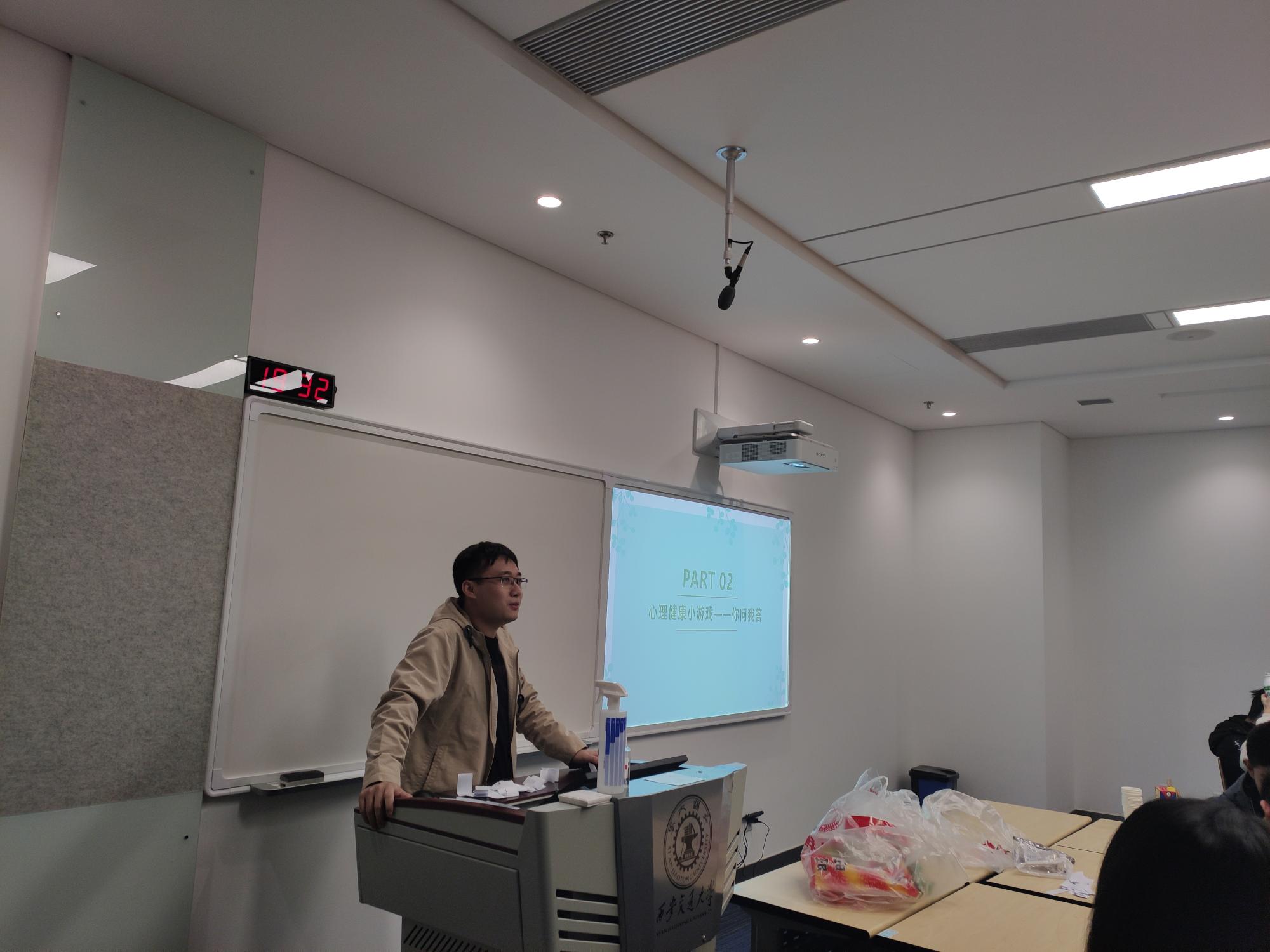 此次班会主要通过心理健康科普视频观看、PPT解说以及同学问答互动等形式展开。班会由心理委员贺姝玥同学主持,向大家介绍了研究生常见的心理问题,如学习基础知识与参加课题的权衡、人际交往关系的问题、自我适应调节的问题等,并通过科普视频的方式让大家学习如果感到焦虑该如何去自我调节,首先应调整健康的作息、合理的饮食,适当培养兴趣爱好,明白情绪没有对错之分,去学着探索适合自己的减压方式等等。