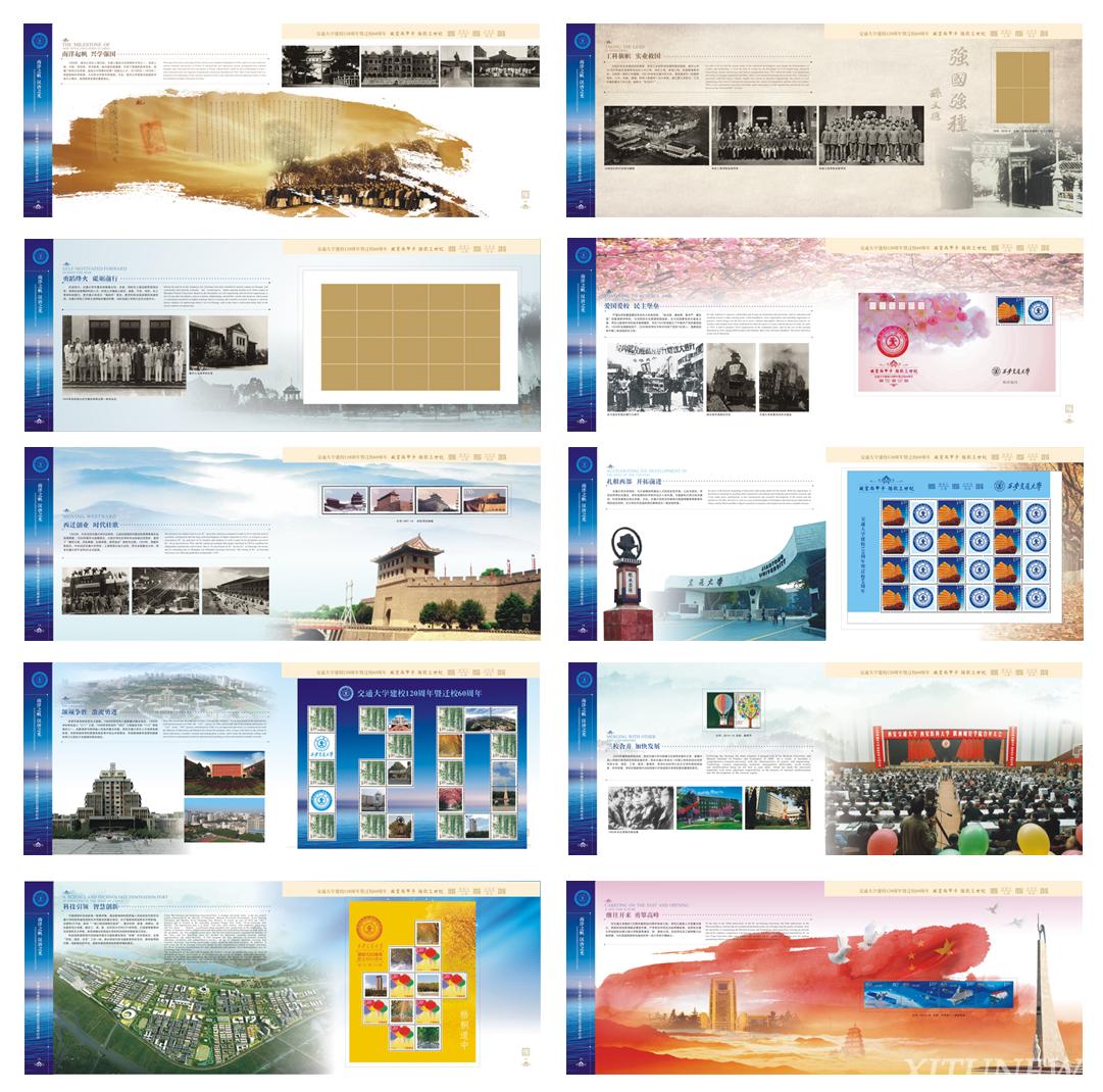 校史珍藏专题邮册,清新的蓝白为主色调,将记忆的色彩在历史的变迁部分融合,将清新的蓝色和淡雅的暖色应用在现代的交大,将热烈的红色放在了对未来的展望。