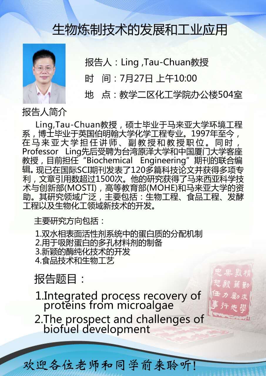 Ling,Tau-Chuan教授,硕士毕业于马来亚大学环境工程系,博士毕业于英国伯明翰大学化学工程专业。1997年至今,在 马 来 亚 大 学 担 任 讲 师 、 副 教 授 和 教 授 职 位 。 同 时 ,Professor Ling先后受聘为台湾原泽大学和中国厦门大学客座教授,目前担任“Biochemical Engineering”期刊的联合编辑。现已在国际SCI期刊发表了120多篇科技论文并获得多项专利,文章引用数超过1500次。他的研究获得了马来西亚科学技术与创新部(MOSTI),高等教育部(MOHE)和马来亚大学的资助。其研究领域广泛,主要包括:生物工程、食品工程、发酵工程以及生物化工领域新技术的开发。