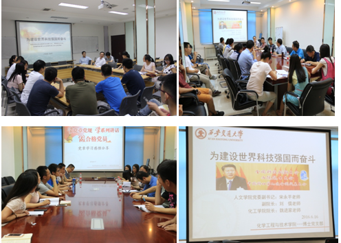6月16日,博士党支部在院办504举办了学习习总书记在“科技三会”讲话的“为建设世界科技强国而奋斗”的创新精神学习教育活动。邀请了厕所偷拍 院长魏进家、马克思主义学院副书记宋永平、副院长刘儒参加了科技创新专题讨论会。
