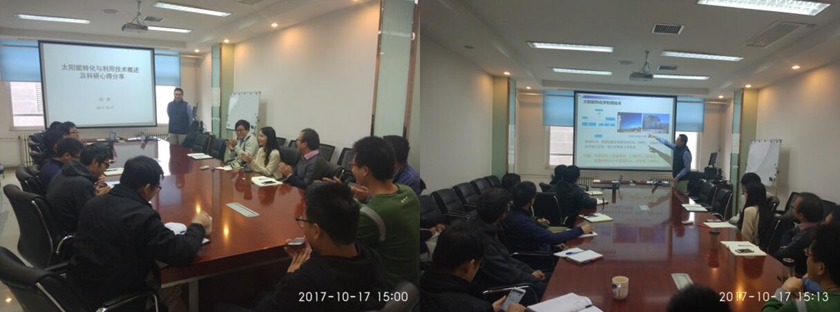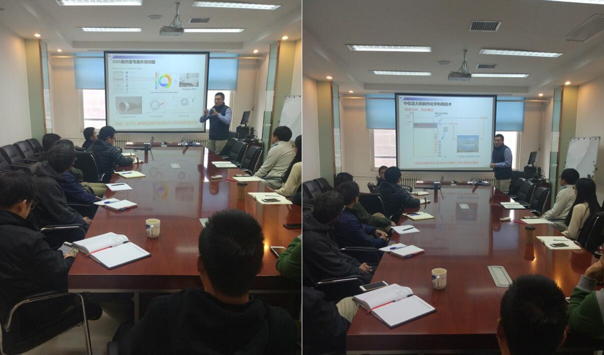 主讲人孙杰教授对“太阳能转化与利用技术”进行了详细讲解。报告围绕太阳能转化与利用技术,详细概述了目前世界上应用和研究的太阳能发电技术,例如PV技术、槽式CSP技术(DSG),讲解了DSG集热管弯曲失效问题,比较了太阳能独立发电技术和互补发电技术,介绍了ISCC互补发电系统,中低温太阳能热化学利用技术。同时,孙老师还阐述了煤基多联产和太阳能热化学分布式能源耦合的前景,重点讲解了槽式广角跟踪主动调控技术。