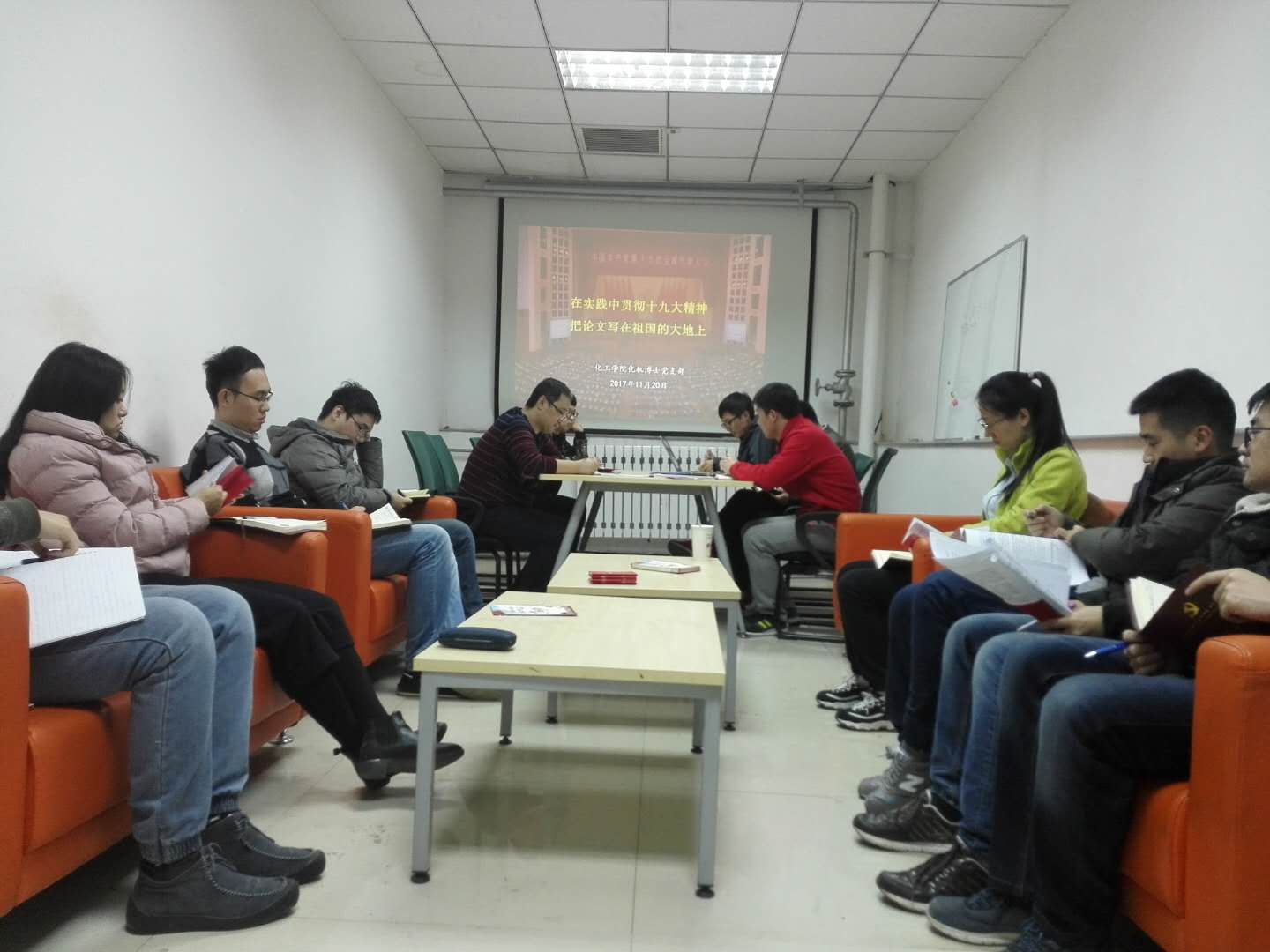首先,由支部书记张洋对开展此次组织生活会议的重要性进行了强调,10月27日新一届中央政治局第一次集体会议,习近平总书记指出,学习宣传贯彻党的十九大精神是全党全国当前和今后一个时期的首要政治任务,同时强调要在学懂上下功夫、在弄通上下功夫、在做实上下功夫;11月1日中共中央发布关于认真学习宣传贯彻党的十九大精神的决定。同时,对贯彻执行党的十九大精神、落实推进学校“双一流“建设规划的情况进行了梳理,重点围绕吸收掌握十九大报告精髓、努力抓好学校“双一流建设”契机、积极开展党内政治生活、自觉做好科研工作与发展规划等方面进行思考。并代表支部向杨老师汇报了本学期开学以来开展组织生活的情况进行了汇报。