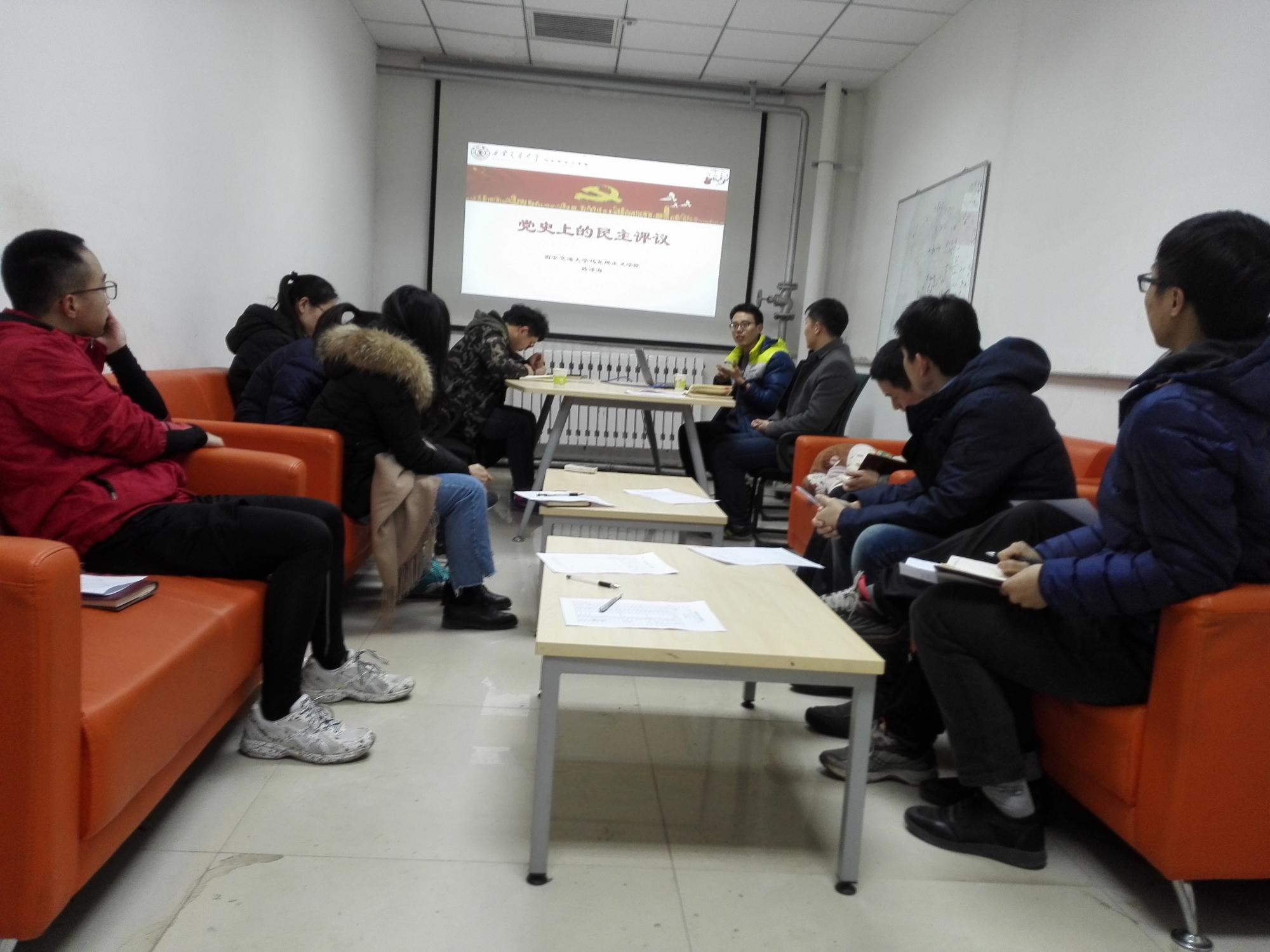 最后,杨贵东老师针对支部党员存在的一些问题提出了相关意见。他说,作为博士生,要有积极态度的同时,还要去寻找和发现科研过程中的创新点,创新点有了,才能将科研以一种相对乐观的形式进行下去,实现科研与心态的良好协调:以好的科研促进好的心态;以好的心态协调好的科研。支部各博士之间应该发扬“传、帮、带”的传统,在思想理论学习上、科研方法上、面对生活的态度上要相互影响、相互学习、相互促进。应当以党建促业务,建设好党建是为了产出更多更好的业务成果。