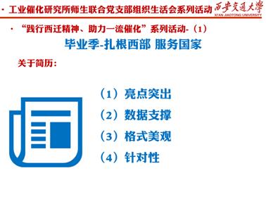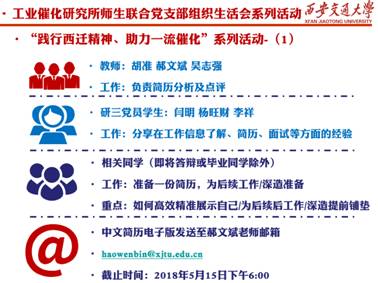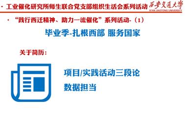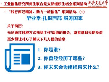 为更好的宣传“西迁精神”,进一步提高支部活力。在毕业季临近之时,了解学生所需,工业催化研究所师生联合党支部围绕“践行西迁精神,助力一流催化”开展了“毕业季-扎根西部,服务国家”主题活动。