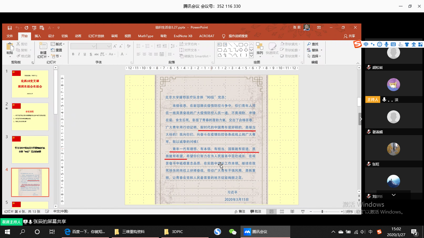 3月27日下午,化机18党支部召开了“科学战疫,科研复工”线上组织生活会。这次会议的主要内容有:学习习近平总书记给北京大学援鄂医疗队全体“90后”党员的回信、学习习近平在G20特别峰会上的重要讲话以及科研工作的分享。会议由支部书记王旭岑主持。