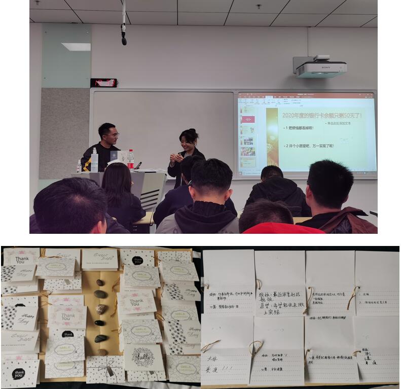 班会还设置了小游戏,2020年度的银行卡余额只剩50天了,心理委员让每位同学在贺卡上匿名写出最近最困扰自己的一个问题并且许一个小心愿,请同学上台随机抽取卡片,对卡片上的烦心事提出自己的解决方式并对卡片上的小心愿给出自己的看法。大家踊跃上台发言,提出了许多有趣、实用的解决困扰的方式,将班会气氛推向高潮。班会结束后,心理委员把写有同学们问题及心愿的小卡片以视频的方式分享到班群里,让大家都了解一下同学们都有哪些困扰及想做的事,通过这种方式让大家明白不是只有自己才有烦恼,我们应该适当释放自己的压力,积极乐观的去科研,去生活。