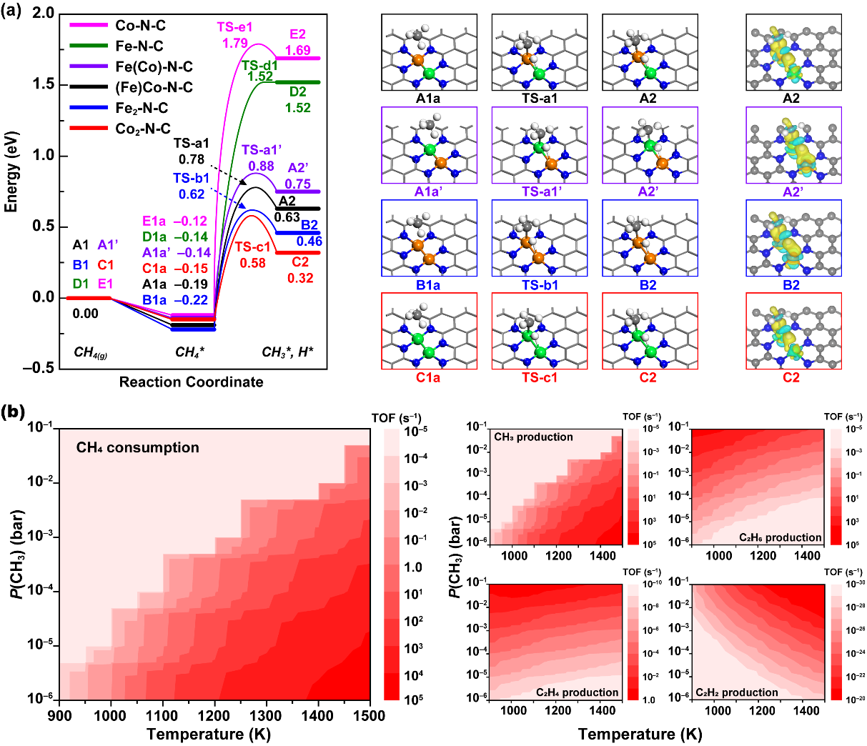 图2甲烷活化与甲烷无氧偶联的理论模拟结果。(a)甲烷在双金属位点与单原子催化剂上的解离势能图以及相应几何结构与电荷密度差分图。(b)甲烷消耗速率与主要产物(CH3、C2H6、C2H4与C2H2)生成速率(转化频率,TOF)。