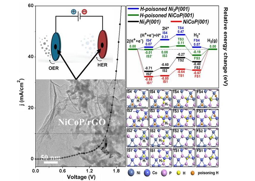 该论文除了创新性地设计、并制备出该类三元复合材料外,还通过实验与理论模拟的手段,系统研究了三元镍钴磷体系的电解水产氢的微观机理。研究表明,在真实反应条件下,当高效反应活性位点被氢毒化时,三元体系中钴掺杂的引入能够带来适当的氢吸附,以及更加温和的氢气脱附,从而使三元体系表现出更优异的电催化产氢性能。该研究结果不仅报道一种高效的电解水产氢催化剂,同时还对新型产氢催化剂的设计起到指导作用。