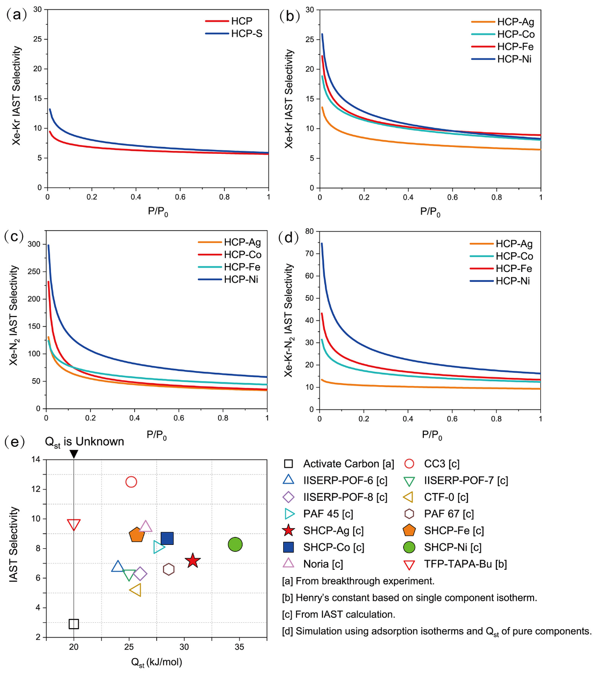 图5HCP-M的IAST选择性:20/80的Xe/Kr(a-b),1/99 Xe/N2(c)和0.5%Xe、0.05%Kr、99.45% N2的三元混合物(d)。