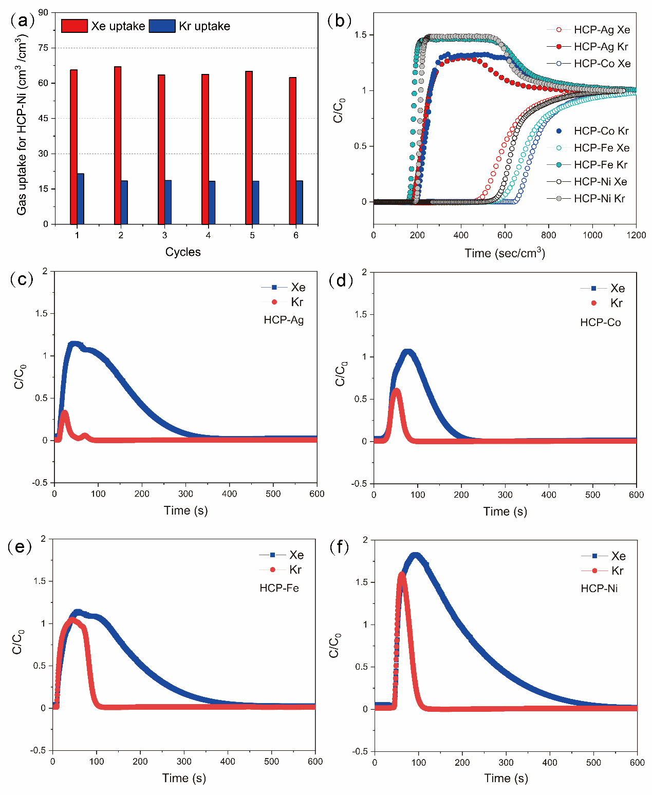 以HCP-Ni为代表,HCP-M材料对Xe具有良好的吸附动力学参数。HCP对Xe和Kr的吸附量-时间的曲线。HCP-M对Xe的最大吸附速率高达20.45-47.19 cm3/(cm3·s),而对Kr仅有9.45-17.38 cm3/(cm3·s),Xe和Kr吸附动力学的差异说明了HCP-M能在动态条件下高效的分离Xe/Kr。通过测试Xe/Kr吸附循环性能和固定床穿透曲线来评价HCP-M在实际分离过程中的可行性。经过6次循环,HCP-Ni对Xe和Kr的吸收没有明显下降,说明吸附剂的再生能力较好。在穿透曲线测试中,Kr均很快穿透,而Xe在吸附柱中能够保持超过150~350 s/cm3,直到吸附剂达到饱和(图6)。HCP-Ag、HCP-Co、HCP-Fe和HCP-Ni的动态吸附量分别为359.30、817.41、908.16和753.43 mmol kg-1。在室温下用He吹扫后,HCP-M柱得到了较好的再生(如图6c-f所示),这得益于HCP-M材料温和的吸附热。综上所述,基于简单快捷的合成过程、优异的稳定性和良好的分离性能,HCP-M有望作为一种高效的Xe/Kr吸附剂,为放射性气体同位素的吸附分离提供技术参考。