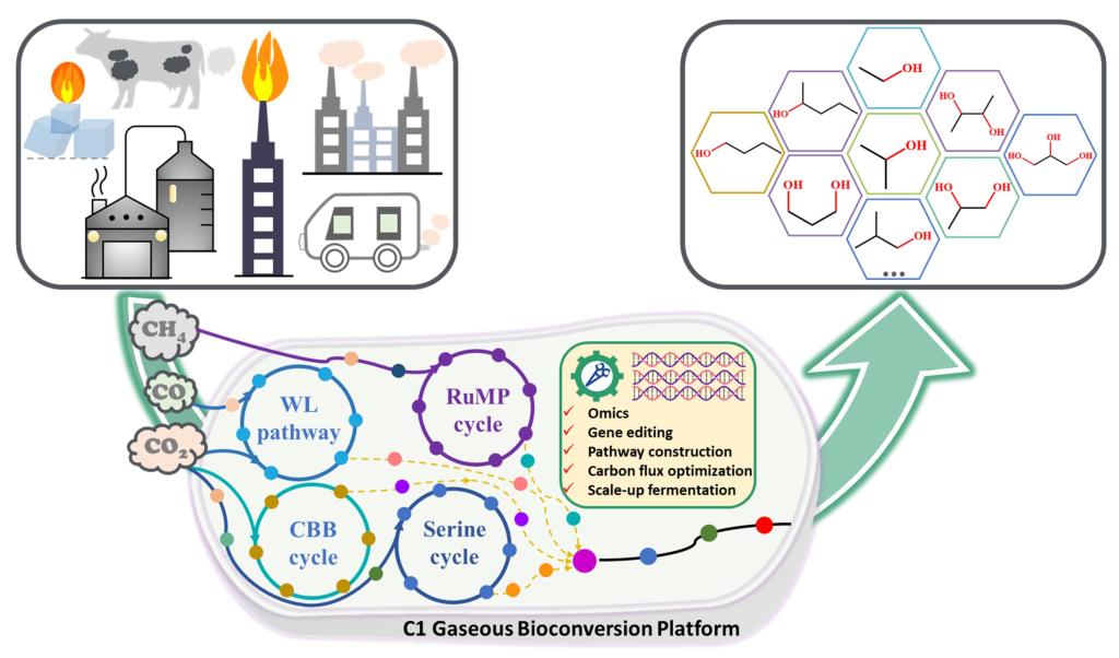 在国家“双碳”战略目标的背景下,如何实现碳资源的有效循环利用,已成为人类社会发展面临的最严峻问题之一。作为一碳温室气体,甲烷(CH4)来源广泛,也是重要的微生物碳源,将其生物转化制备化学品,既有助于温室气体减排,又可拓宽生物制造原料来源,为助力实现“碳中和”目标提供技术支撑和解决方案。作为石油炼制的一类重要的化学品,醇类化合物可广泛用于能源、材料、医药等行业领域。为摆脱对传统石化资源的依赖,利用微生物合成醇类化合物,已成为极具潜力的生物制造路线,并对推动绿色经济发挥重要作用。