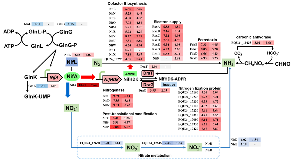 费强课题组长期围绕嗜甲烷菌的人工构建及其甲烷代谢机制进行探究,近日首次通过实验证实了I型嗜甲烷菌模式菌株的氮气固定能力,揭示了该菌株关键转录因子NifA对胞内固氮功能酶、甲烷代谢、能量供给、膜转运和细胞生长等基因的调控作用和影响机制。该研究不仅为了解嗜甲烷菌的生理特性和胞内氮代谢奠定了研究基础,还为甲烷-氮气共利用合成蛋白饲料等高附加值产品提供了技术经济可行性策略。该研究成果发表在国际应用生物技术领域权威期刊《应用微生物与生物技术》(Applied Microbiology and Biotechnology)。
