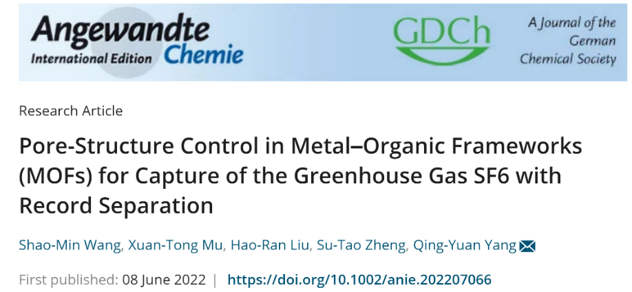 相关成果以“金属-有机框架(MOFs)的孔结构调控用于捕获温室气体SF6并具有创记录的分离比”(Pore-Structure Control in Metal–Organic Frameworks (MOFs) for Capture of the Greenhouse Gas SF6 with Record Separation)为题发表在《德国应用化学》(Angew. Chem. Int. Ed.)上,并被选为热点论文(Hot paper)。该研究工作由厕所偷拍